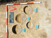 Zásobní jámy, v jedné na dně pohřeb a pohozená kostra dítěte (datace do br.une ne zcela jistá).